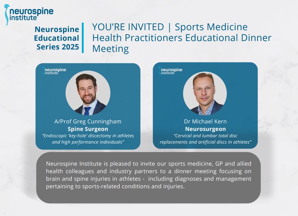 Neurospine Institute is pleased to invite our sports medicine, GP and allied health colleagues and industry partners to a dinner meeting focusing on brain and spine injuries in athletes – including diagnoses and management pertaining to sports-related conditions and injuries.