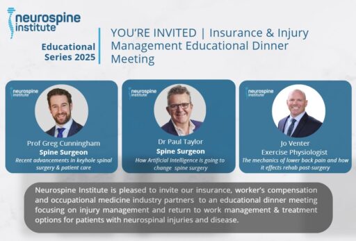 Neurospine Institute is pleased to invite our health colleagues and industry partners to a dinner meeting on Thursday October 25 to discuss insurance and post-surgery recovery management.